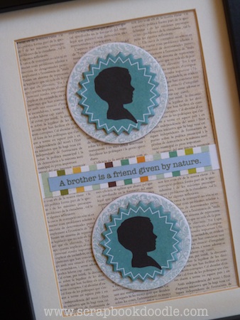 I have an Altered Frame to share with you today that was created using the “My Boy” scrapbook kit. The frame is NOT included in the kit. I bought the black frame from Ikea. This was a very easy and quick project to do. It only took me less than 15 minutes to make. This is for my kids’ room. The sticker in the middle of the frame is from Authentique Paper from the “Loyal” collection which is included in the kit. The quote on the sticker reads “A Brother is a friend given by Nature.”