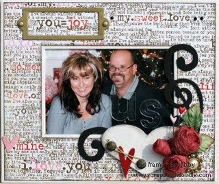 I cut the paper to my measurements and inked the edges. Let me just say I loved this paper! After I cut if I decided that I wanted to highlight some of the saying that were on it. I used a Heidi Swapp Chipboard Label with brads on some words and others I used Chipboard hearts of Kaiser Pearls. Fun, Fun, Fun!